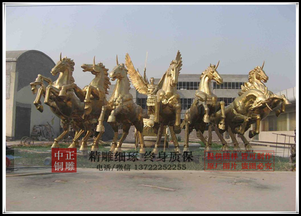 歐洲的太陽神戰車前邊一般是四匹馬,而中國為了使戰車更威武,更宏大,并取“六六大順”,“八八大發”之意,太陽神阿波羅戰車雕塑前面加多到六匹馬,八匹馬,并且讓阿波羅背上長上了鳳凰的翅膀。這些戰馬栩栩如生,脖子上爆起的青筋、身上滾動的肌肉都清晰可見,它們神采飛揚,神態各異,或奔騰欲飛,或低首拼搏。